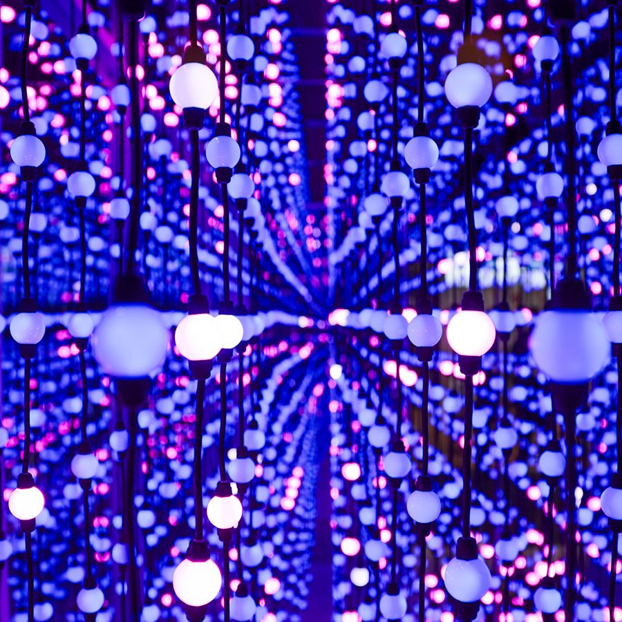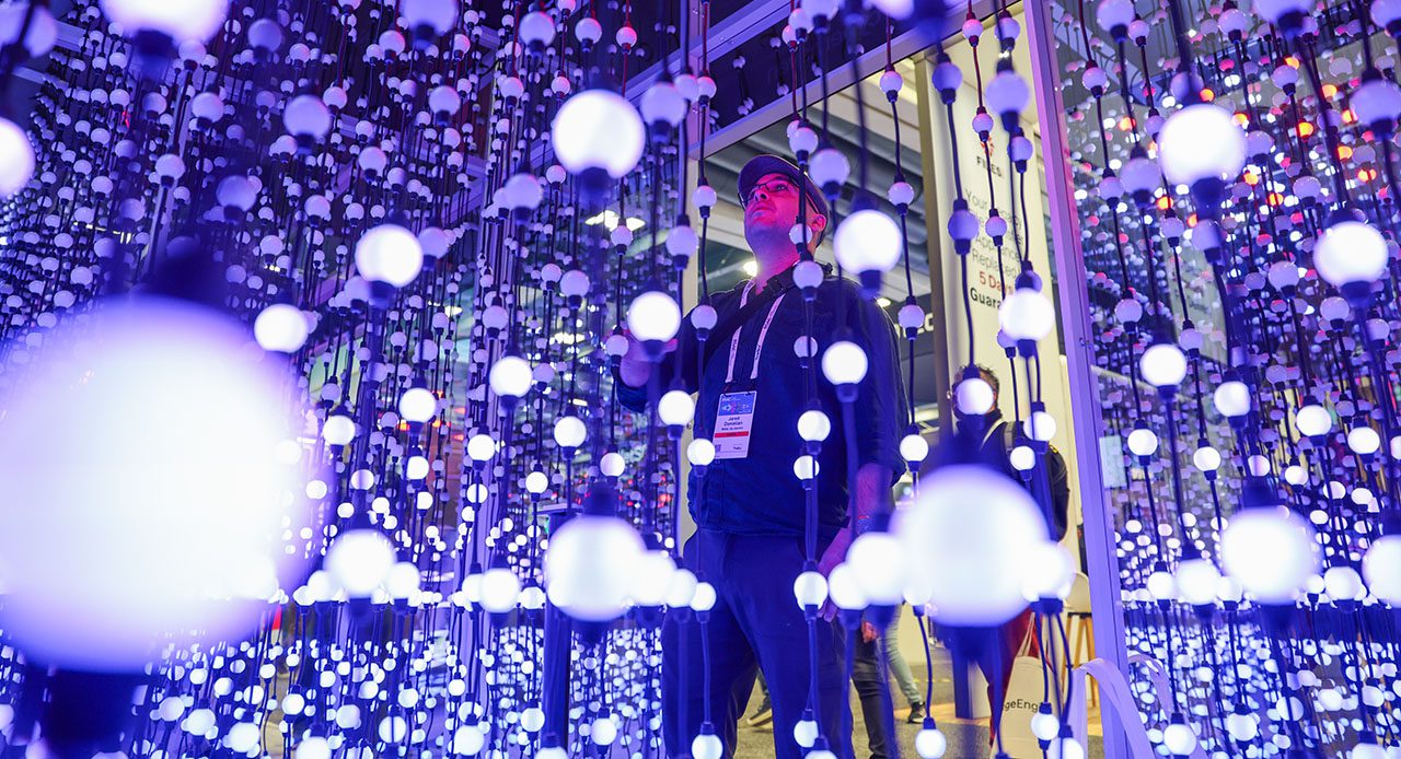 For their RSA exhibit, Cyberhaven set out to create something truly original—an immersive experience unlike anything the show floor had seen. At the heart of that vision was the Infinity Room: a bold fusion of art and technology designed to transform an invisible product into something, well, visible. Initially inspired by static art installations, we collaborated with Cyberhaven to evolve the concept into a brand-specific activation powered by responsive technology and a strategic game motif rooted in their mission to prevent data loss. We reimagined the traditional Infinity Room using two-way mirrored glass and thousands of LEDs to simulate infinite depth within a compact 8′ x 12′ footprint. Guests played Trace Invaders, a motion-activated arcade-style game where players chased a glowing orb of symbolic data, tracked in real time via gesture control. Lighting and sound, driven by a custom TouchDesigner system, reacted to every movement—creating an unforgettable, sensory-driven experience. The result: nonstop crowds, real engagement, and palpable excitement for a visionary brand.